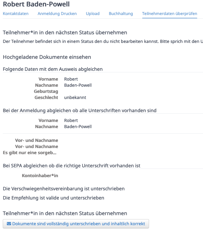 Nachdem ihr alle Anmeldedokumente, in Papierform, überprüft habt könnt ihr die jeweilige Person mit dem Button „Dokumente sind vollständig …“ in den nächsten Status „bestätigt durch Leitung“ schalten. Die Papierdokumente sammelt ihr bis ihr alle Unitmitglieder vollständig habt.