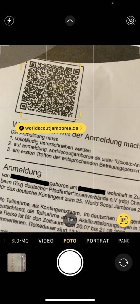 Als Unit Leitung sammelt ihr alle (TN und UL) Papieranmeldungen, Sepa-Mandate und Medizinbögen eurer Unit ein. Um die Anmeldung zu bestätigen, scannt ihr den QR Code mit einem Smartphone oder Tablet. Es ist hilfreich, wenn ihr euch schon vorher als UL in der Anmeldung eingelogged habt.