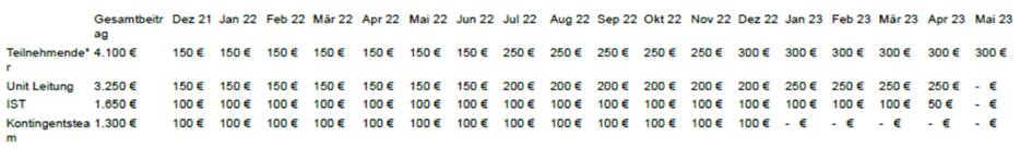Der Teilnahmebetrag richtet sich nach der gewählten Teilnahmevariante (s.o. Ziff. 3.2, Reiseform und Pakete) und ggf. nach der Funktion des Teilnehmers im Kontingent. Das SEPA Lastschriftverfahren wird nach folgendem Plan eingezogen. Der Einzug erfolgt am 5. des jeweiligen Monats bzw. am darauffolgenden Werktag.